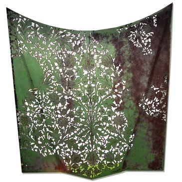 Through his use of found metal objects (in this exhibition car body parts) —a material often associated with strength, permanence, and machinery—Gilbart invites us to think about the value of labour, both past and present. His hand cut motifs resonate with the spirit of the Arts and Crafts Movement, which championed the handmade in response to industrialization, and connects to a growing interest in craft across Canada today.
