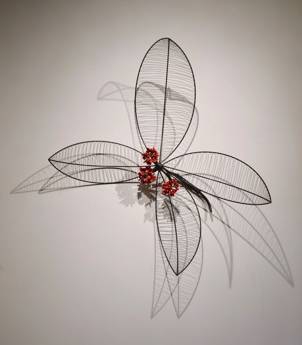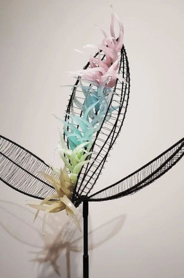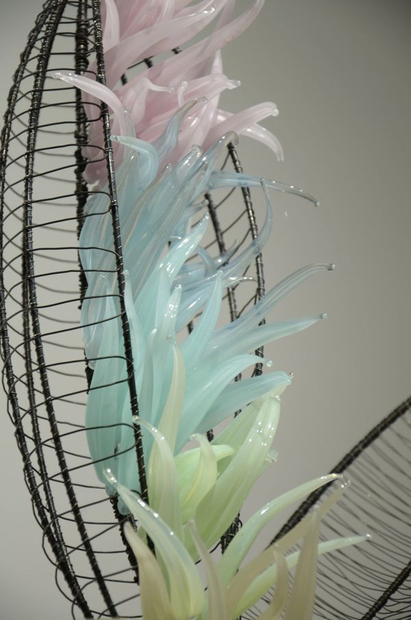 "We are all constantly surrounded by something. The landscape that surrounds us shapes us and influences us as we function within it. In my continuing series of ‘Wired Forms’ the wired landscape, in its complexity, transforms the simple glass form. The ‘Wire Form’ series explored the combined use of glass and metal in a more sculptural format. This series liberated my work from the constraints of the functional vessel and has lead to the development of the ‘Grove Columns’. I have worked with scale to create a presence; they demand that observers engage with them in a more physical and direct way. Using numerous columns to define a space, I incorporate light through the multiple transparent or opaque glass elements. Drawing on natural and abstracted forms I have created a series of work, which is harmonious and compelling through the seasons."