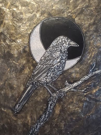 "Crow Under the Crescent Moon", 2024, embossed aluminum, 21 x 15
