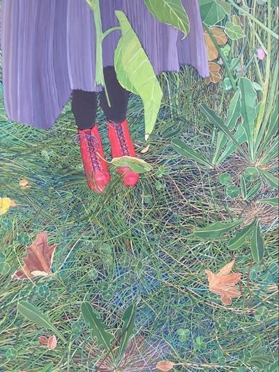 "Michele and Virginia (the Artist, aged 59, in a Dress Stitched for Virginia Woolf, Adrift in an Autumn Garden)" by Tanya Zaryski, acrylic on cradled wood panel.